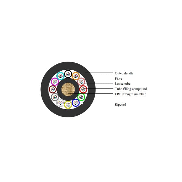 Aramidgarn rundt tube for styrke, og polypropylen kappe. Kabelen har en liten